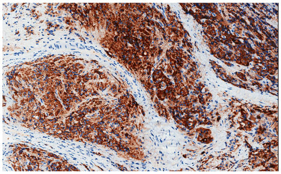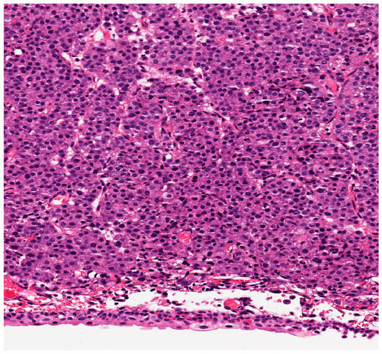 Morphologically, AVPCa is made up of solid sheets of cells devoid of pleomorphism, with round and enlarged nuclei with prominent nucleoli and slightly basophilic cytoplasm [20] (Figure 2). The cells do not show the typical architectural features of prostatic adenocarcinoma, and mimic the undifferentiated carcinoma of other organs and locations. The final diagnosis is based on the immunohistochemical expression of markers usually seen in PCa, particularly the Prostate-Specific Membrane Antigen (see below) [11].