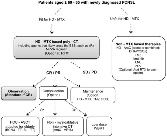 Older age is also associated with a higher frequency of comorbidities, which may increase the risk of therapy-induced toxicity that alters the pharmacokinetics and pharmacodynamics of therapy and may increase the risk of toxicities. However, as discussed below, elderly patients with PCNSL can achieve a response even to more intense treatments, so they should not be excluded from these therapies only on the basis of age criteria, but rather on the basis of a global assessment for fitness. Nevertheless, this approach is still very scarce. In a pilot study, Schorb et al. have utilized the Cumulative Illness Rating Scale–Geriatric score as an inclusion criterion in addition to age [24]. Such approaches should be developed.