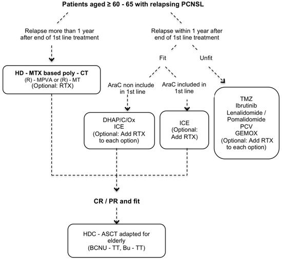 Finally, we propose a working algorithm for the management of elderly patients with newly and relapsing PCNSL (Figure 1 and Figure 2, respectively). This algorithm represents authors’ preferred choices and not guidelines as we lack controlled data from prospective studies.