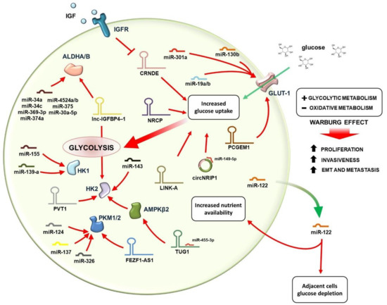 One of the main characteristics of tumor cells is an accelerated energetic demand to support their rapid proliferation and biosynthetic reactions; the main nutrient used by cancer cells to produce energy for tumor growth is glucose, whose carbon bonds are oxidized to generate ATP [17]. Cancer cells increase their energetic metabolism by adopting two main strategies: first, malignant cells promote glucose supply by increasing its uptake and by subtracting it from normal cells within the tumor microenvironment; second, they prevent energy production through mitochondrial oxidative phosphorylation, generally preferred in normal cells, while accelerating the glycolysis pathway, less efficient in ATP production but more rapid [12]. As a consequence of this phenomenon, known as the Warburg effect, even in the presence of oxygen and fully functioning mitochondria, cancer cells become energetically independent and resistant to anoikis death, increasing their probability of survival and acquiring the ability to metastasize [30]. Cancer cells reprogram their glucose metabolism based on a complex regulatory network, made of molecular circuits involving several oncogenes and tumor-suppressor genes, whose expression is often modulated by ncRNAs (Figure 2).