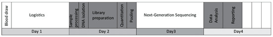 In the first part of the laboratory assay development, we optimized the workflow from sample enrollment to reporting. Clinical data of the patients were systematically processed in an easy-to-use format and harmonized with the sequencing data. A standardized preanalytical protocol was used to ensure reliable cfDNA quality and quantity. Altogether, 293 plasma samples were processed in the study. During assay optimization, plasma samples were collected and stored at −80 °C after two rounds of centrifugation. The median hands-on time from blood drawing to report release was eight hours. Following the implementation of the panel into routine workflow for prospective samples, the average turnaround time was four working days.