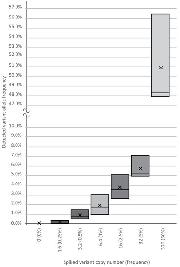 Sensitivity of the BC-monitor assay. Appropriate serial dilutions of cfDNA containing known SNPs were made, and each tube was spiked with 1.6, 3.2, 6.4, 16, 32, and 320 copies of the variant. Boxes indicate the interquartile range and median, while the average of each dataset is indicated by an X mark.