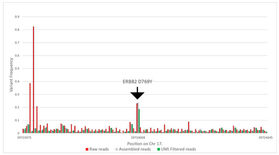 Raw reads were filtered for quality. In the case of each read pair, only those were included in the later steps that had a maximum of 30 bases below Q28; the number of bases was determined as 10% of the overall maximum read length. This step resulted in 0.5–1% of reads being excluded from the further steps. Next, we carried out an assembly of R1 and R2 reads, where only perfectly aligned reads were accepted to further lower sequencing errors on the overlapping regions. This step was enabled in the cases where we designed primers for shorter than 285-nt-long amplicons. The tool filtered out 33–50% of the reads. Subsequently, we tested the beginning and the end of each assembled read pair for the correct universal tag sequences with the Smith–Waterman algorithm, allowing two-base deviations, removing a further 1% to 2% of the reads. After that, using the UMI at each end, we clustered all reads with the same UMI and removed all read clusters that had more than one read. With this step, we removed all reads that were possible PCR duplicates. We included coverage information for samples where the whole panel was run, including the healthy samples as well in Table S1. Figure 3 summarizes the results of the above filtering on variant frequencies on a selected ERBB2 variant. In this particular case, the raw coverage was 434,449, which was filtered to 124,470 reads after assembly, and finally, 37,719 reads were used for variant calling.