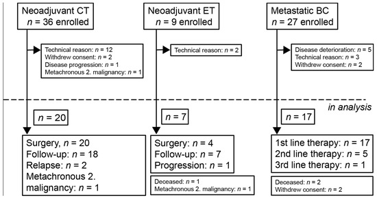 Between February 2018 and March 2021, 45 patients were altogether enrolled into the “neoadjuvant” (neoadjuvant chemotherapy—NCT; neoadjuvant endocrine therapy—NET) and 27 patients into the “metastatic” group (metastatic breast cancer—MBC) of breast cancer patients, and due to various reasons, 27 and 17 patients, respectively, remained in the analysis (Figure 4). The median follow-up times in the NCT, NET, and MBC groups were 21.2 (6.8–30.3), 23.2 (11.9–32.0), and 18.5 (1–33.7) months, respectively. In the NCT cohort, one patient received paclitaxel-carboplatin chemotherapy; all the other patients received taxane-anthracycline combinations. In four HER2-positive cases, chemotherapy was complemented with anti-HER2 therapy (trastuzumab ± pertuzumab). In all the NET cases, systemic therapy was an AI (letrozole or anastrozole) that was combined with goserelin in one premenopausal patient. Surgery was performed in all NCT patients but only in four of the NET patients; in three cases, surgery was refused by the patient. The treatment results, together with the individual tumor stages and subtypes of those neoadjuvant cases in which molecular aberrations were detected in the tumor or plasma, are included in Tables S1 and S2. Two of the NCT patients were not compliant in follow-up blood-sampling due to the COVID-19 pandemic situation.