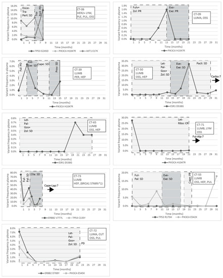 Circulating molecular aberrations in selected individual patients with metastatic breast cancer; the molecular subtype, metastatic organ involvement, the mutations detected in the primary tumor/metastasis, and the treatments and their effectiveness are indicated; the introduction of a new treatment modality was always due to progression, and the best response to a specific treatment is indicated within a column. If the perpendicular line is dashed, it indicates the change of a treatment modality, while, if contiguous, that means the loss of the patient. Abbreviations: LYM: lymph node metastasis, PLE: pleural metastasis, PUL: pulmonary metastasis, OSS: bone metastasis, HEP: liver metastasis, PER: peritoneal metastasis, CUT: cutaneous metastasis, CR: complete regression, PR: partial regression, SD: stable disease, PD: progressive disease, DTX: docetaxel, TRA: Trastuzumab, 2C4: Pertuzumab, LZL: Letrozole, PBB: Plabociclib, GOS: goserelin ZOL: Zoledronic Acid, EVL: Everolimus, EXM: Exemestane, PTX: Paclitaxel, CBDCA: Carboplatin, FUL: Fulvestrant, RBC: Ribociclib, ALP: Alpelisib, CAPE: Capecitabine, PRO: Provera, OLA: Olaparib, and LAP: Lapatinib.