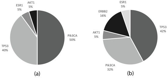 Among the 27 cases in the neoadjuvant cohort, with FFPE tumor samples available, 15 had pathogenic mutations (55%), and in two cases, two mutations were detected; 8/15 patients (53.3%) had alterations in the PIK3CA, 7/15 (46.6%) in the TP53, and 1/15 (6.6%) in the AKT1 and ESR1 genes. In two patients, TP53 co-occurred with either PIK3CA or ESR1 aberrations.