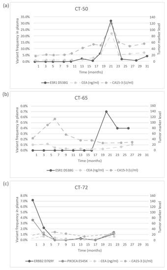 Circulating molecular aberrations in selected individual patients in relation to conventional tumor markers. (a) In the case of CT-50, CA 15-3 and CEA followed the level of tumor ESR1 D538G well. (b) In the case of CT-65, while CA 15-3 and CEA reflected well the favorable therapeutic response to letrozole-Palbociclib during the long treatment period, a newly developed mutation was detected with suspected disease progression and elevated tumor markers, but until the analysis, no clinical progression was validated. (c) In the case of CT-72, while the ctDNA alterations decreased following the start of treatment with letrozole-Palbociclib, the concentrations of CA 15-3 and CEA did not follow the tumor regression sensitively.