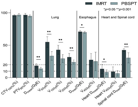A dose–volume histogram for an average of matched IMRT and PBSPT plans is shown in Figure 4. Although both plans achieved similar CTV/PTV coverage under the institutional dose constraints, PBSPT significantly reduced the volume of lungs, heart, and spinal cord exposed to low-to-high doses of radiation (Table S2). On the contrary, PBSPT increased the intermediate-to-high doses delivered to the esophagus (45, 55, and 66 GyE), whereas PBSPT delivered similar maximum doses to the esophagus (69.7 vs. 71.0 GyE, p = 0.241) when compared to matched IMRT plans.