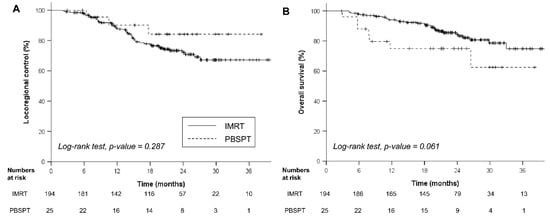 Clinical outcomes after IMRT and PBSPT: LRC (A) and OS (B). Abbreviations: IMRT, intensity-modulated radiation therapy; PBSPT, pencil beam scanning proton therapy; LRC, locoregional control; OS, overall survival.