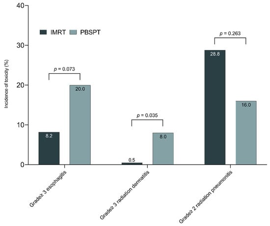 The toxicities reported in this study are summarized in Table 3. Twenty-four (11.0%) grade 3 or more acute toxic events were observed in the entire cohort. Among 21 patients with grade 3 or more esophagitis, all patients were hospitalized with temporary total parenteral nutrition and five patients required tube feeding. There was a trend toward frequent grade ≥ 3 esophagitis with PBSPT (20.0% vs. 8.2%, p = 0.073, Figure 3); grade ≥ 3 radiation dermatitis was more frequently observed in the PBSPT group than the IMRT group (8.0% vs. 0.5%, p = 0.035). PBSPT was associated with frequent grade ≥3 esophagitis after multivariable analysis (odds ratio (OR) 3.68, Table 4). Additionally, esophagus V45GyE ≥ 35% was also related to the incidence of grade ≥ 3 esophagitis in multivariable analysis. There were two patients in the IMRT group who experienced trachea-esophageal fistula requiring surgical intervention. There were 60 patients (27.4%) who experienced symptomatic RP with comparable incidence between the IMRT and PBSPT groups (28.9% vs. 16.0%, p = 0.263). Multivariable analysis showed that both-lung V10GyE ≥ 45% significantly increased the grade ≥ 2 RP (OR 4.37, Table 4). Differences in declined pulmonary function between the IMRT and PBSPT groups were not statistically significant throughout the follow-up period (Figure S2). Regarding cardiac adverse events, there was no significant difference between the IMRT and PBSPT groups (9.3% vs. 8.0%, Table 4).