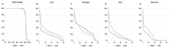 Dose–volume histogram for an average of matched intensity-modulated radiation therapy (IMRT) and pencil beam scanning proton therapy (PBSPT) plans: planning target volume (A); both lungs (B); esophagus (C); heart (D); spinal cord (E). Abbreviations: IMRT, intensity-modulated radiation therapy; PBSPT, pencil beam scanning proton therapy.