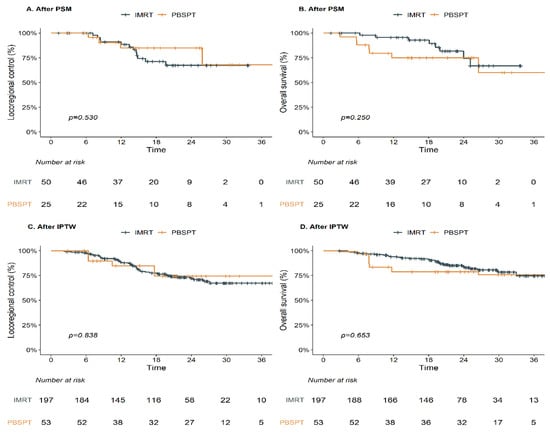 Clinical outcomes following IMRT and PBSPT after propensity score-adjusted analysis: LRC after PSM (A); OS after PSM (B); LRC after IPTW (C); OS after IPTW (D). Abbreviations: IMRT, intensity-modulated radiation therapy; PBSPT, pencil beam scanning proton therapy; LRC, locoregional control; OS, overall survival; PSM, propensity score matching; IPTW, inverse probability of treatment weighting.