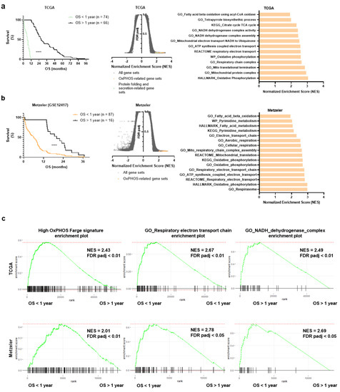 The publically available human AML data sets from TCGA-AML [24] and the Metzeler [25] cohort were analyzed to assess whether there was an association between the mitochondrial and OxPHOS gene expression with overall survival. Briefly, each cohort was divided into short or long overall survival (OS > or < to 1 year for both cohorts; Figure 1a,b) and a gene set enrichment analysis (GSEA) was performed. In both cohorts, OxPHOS- and mitochondrial metabolism-related gene signatures were enriched in the short overall survival groups of patients (Figure 1a,b). In addition, sets of genes involved in the unfolded protein response and mitochondrial stress were also enriched in short survival patients from the TCGA cohort. Interestingly, a higher expression of OxPHOS and NADH-dehydrogenase ETCI complex-related gene signatures derived from AML patients [10] was also seen in shorter survival groups of both TCGA and Metzeler cohorts (Figure 1c), suggesting an involvement of ETCI and mitochondrial metabolism as adverse prognosticators for AML patients.