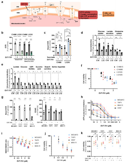 EVT-701 blocks OxPHOS by inhibiting ETCI and induces a profound metabolic compensatory reprogramming. (a) Schematic representation of the mode of action of EVT-701. (b) Effect of EVT-701 on the basal oxygen consumption rate and ATP production linked to OCR in murine AML cells, assessed by Seahorse (n = 4). (c) Effect of 10 mM succinate supplementation upon ETCI inhibition with EVT-701 in permeabilized leukemic cells (n = 4 C1498, n = 3 L1201). (d) Effect of EVT-701 on lactate and glucose in the exometabolome of C1498 and L1210 after 24 h incubation (n = 3). (e) Effect of EVT-701 on intracellular metabolites in C1498 and L1210 cells after 24 h incubation (n = 3). (f) Effect of EVT-701 on C1498 and L1210 proliferation (n = 4). (g) Effect of EVT-701 on oxygen consumption rate and extracellular acidification rate in human AML cell lines assessed by Seahorse (n = 4). (h) Dose-response effect of EVT-701 on total ATP and mitochondrial ATP production in human AML cell lines assessed by Cell Titer Glo (n = 4). (i) NAD+/NADH ratio change in response to EVT-701 in human AML cell lines (n = 4). (j) Dose-response effect of EVT-701 on human AML cell line proliferation (n = 4). (k) Effect of EVT-701, AraC or their combination on human AML cell line proliferation (n = 4). * is p < 0.05, ** is p < 0.01, *** is p < 0.005, **** is p < 0.001, ns is statistically non-significant.