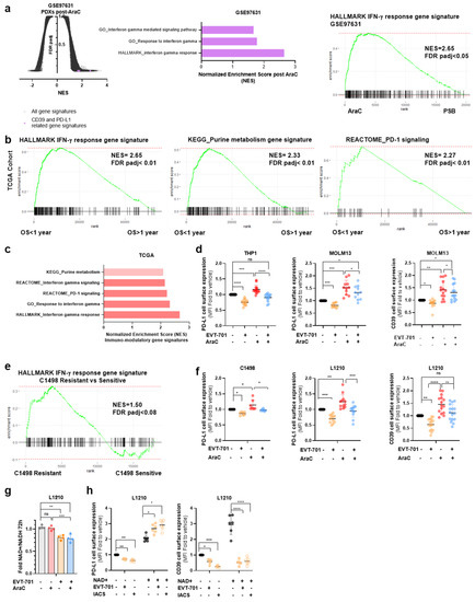 EVT-701 decreases the immune checkpoint expression to boost the immune response and increase the therapeutic benefit. (a) Volcano plot showing GSEA results in the GSE97631 data set containing the transcriptomic profiles of residual AML in PDXs AraC or vehicle-treated. Immune modulation-related gene signatures are in purple. In the middle, a plot showing AraC vs. PBS-treated PDXs differentially expressed gene sets with their normalized enrichment scores (NES). On the right, the enrichment plot of the hallmark Interferon-γ gene signature compatible with PD-L1 increases after AraC in vivo. (b) Enrichment plots of the hallmark Interferon-γ gene signature (left), KEGG purine metabolism-containing CD39 (middle) and Reactome PD-1 signaling (right) in the short group survival of the TCGA cohort. (c) Plot showing CD39- and PD-L1-related signatures in the short group of the TCGA cohort with their normalized enrichment scores (NES). (d) FACS assessment of the modulation of inducible PD-L1 and CD39 membrane expression on THP1 and MOLM13 cells by EVT-701, AraC or a combination of both (n > 10). (e) Enrichment plot of the hallmark Interferon-γ gene signature in C1498-resistant vs. -sensitive cell transcriptomes. (f) FACs assessment of the modulation of inducible and CD39 membrane expression on C1498 (n = 7) and L1210 (n > 10) by EVT-701, AraC or a combination of both at 72 h. (g) Effect of EVT-701, AraC or a combination of both on the NAD+/NADH ratio in L1210 at 72 h (n = 4). (h) Effect of exogenous NAD+ on the modulation of PD-L1 and CD39 membrane levels by EVT-701 or with IACS (n = 6). * is p < 0.05, ** is p < 0.01, *** is p < 0.005, **** is p < 0.001, ns is statistically non-significant.