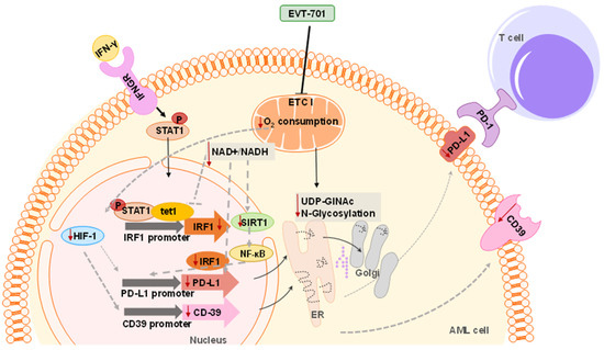 In addition, functional ETCI and NAD metabolisms have been shown to be involved in the epigenetic regulation of inducible PD-L1 expression [27]. In fact, this study proposed a mechanism by which NAD+ metabolism, via TCA intermediates such α-ketoglutarate (α-KG), activates TET1. TET1 then interacts with p-STAT1, previously phosphorylated and activated by JAK after IFN-γ IFNGR stimulation. They showed that the TET1-p-STAT1 interaction stabilized TET-1 and facilitated the TET1-mediated demethylation of the Irf1 promoter, which subsequently promotes the generation of IRF1 and induces PD-L1 expression [48,49,50]. The link between TET1 activity and PD-L1 expression has already been proposed in gliomas. Lower PD-L1 levels have been reported in patients bearing IDH mutations, increasing (R)-2-hydroxyglutarate (2-HG) oncometabolite production [51,52]. 2-HG is a competitive inhibitor of multiple α-KG-dependent dioxygenases, which includes the TET family of 5-methlycytosine hydroxylase [53,54] thereby explaining the loss of TET activity concomitant with IDH mutations. It has recently been reported that in response to 2-HG inhibition, the PD-L1 levels in IDH1 mutant tumors were increased to the same levels observed in WT-IDH gliomas [55]. As IDH mutations are also present in several AML patients [56,57], the same profile regarding the IDH mutational state and PD-L1 levels might also be expected although this remains to be proven. In addition, TET1 repression has also been associated with increased tumor-infiltrating immune cells in several cancer types such as basal-like breast cancer (BLBC), melanoma, ovarian, lung and thyroid cancer [58]. Considering all of the above, we propose that ETCI-NADH dehydrogenase activity regulates the level and ratios of NAD+/NADH, which is essential for SIRT1- and/or TET1-mediated PD-L1 stimulation. Recent studies showed that CD39 expression was not induced by IFN-γ [59,60] whereas it can be induced under hypoxic conditions [61,62]. ETCI inhibitors have already been reported to interfere with HIF stabilization such as IACS [15,63] and metformin [64,65,66]. EVT-701 was also developed from a screening campaign to characterize HIF-1α inhibitors [22]; therefore, we propose an impairment of hypoxic signaling by interfering with HIF-1α stabilization as the mechanism by which EVT-701 decreases CD39 expression. Importantly, EVT-701 was shown to decrease the levels of the N-glycosylation unit UDP-GlcNAc, which can impair the CD39 function and localization in the cell membrane [67], highlighting another layer of the regulation of CD39 by EVT-701. Further studies will be needed to elucidate the exact mechanism involved in the ETCI regulation of PD-L1 and CD39 (Figure 5). Future perspective research would answer the question of whether ETCI inhibition decreases immune checkpoints in patient-derived samples and, eventually, in patient-derived xenografts (PDXs).
