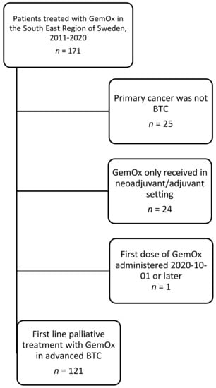 Over the study period (2011–2020), a total of 171 patients treated with at least one cycle of GemOx, at any of the covered oncology centres in the South East Region of Sweden, were identified. Fifty of these were excluded due to exclusion criteria, leaving a total cohort of 121 patients receiving first-line palliative intent GemOx for advanced BTC (Figure 1). Patient and treatment characteristics are displayed in Table 1. A minority of patients (n = 35, 29%) had previously been treated with curative intent resection, and 17 (14%) had received previous adjuvant chemotherapy, corresponding to approximately half of the patients (n = 17, 49%) that underwent surgery. The most commonly used adjuvant chemotherapy was capecitabine (n = 11, 65%). Most patients had one organ with metastasis at date of incurable disease (n = 59, 49%). The most common site of metastasis was the liver (n = 36, 30%) followed by peritoneum (n = 27, 22%) and lymph nodes (n = 24, 20%). A majority of patients (n = 101, 84%) had the diagnosis verified with histology or cytology.