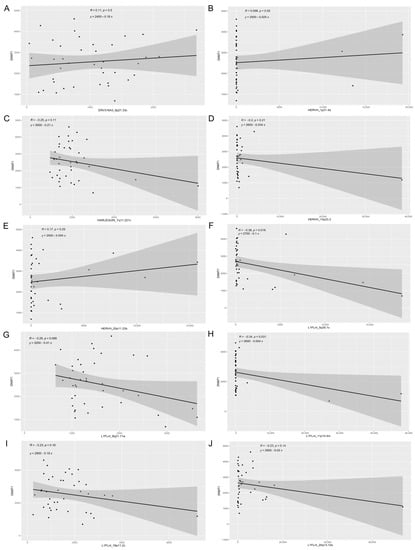 Figure 4. Interleukin-20 gene family and retroelement expression. Scatter plots show (A) IL-19 x ERVLE_1q32.1e, (B) IL20RA vs. HERVH_6q23.3, (C) IL20RA2 vs. HERVH_6q23.3, (D) IL20 vs. L1FLnI_1q32.1n, (E) IL20RB vs. L1FLnI_3q22.3g, (F) IL20RB vs. L1FLnI_3q22.3h, (G) IL20RB vs. L1FLnI_3q22.3i, (H) IL20RB vs. L1FLnI_3q22.3k, (I) IL20RB vs. L1FLnI_3q22.3l and (J) IL19 vs. L1FLnI_1q32.1n. Pearson correlation coefficient (R), p-value (p) and linear equation are shown.
