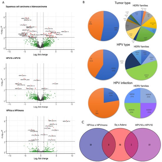 Figure 2. Retrotransposon loci differentially expressed in cervical cancer. (A) Volcano plot shows differentially L1 and HERV loci expressed with respect to cervical tumor histological type (squamous cell carcinoma x adenocarcinoma), infecting HPV type (HPV18 vs. HPV16) and HPV infection (HPV coinfection (HPVco) vs. HPV monoinfection (HPVmono)). (B) Proportion of differentially expressed L1 and HERV found in samples (left panels) and of HERV families found (right panels) with respect to each comparison depicted in A. (C) Venn plot shows exclusive and common HERV and L1 loci found in each analysis (squamous cell carcinoma (Sq) vs. adenocarcinoma (Adeno), HPV18 vs. HPV16 and HPVco vs. HPVmono).