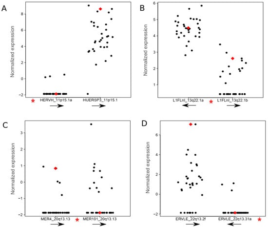 Figure 3. Retroelement expression near HPV integration sites. The normalized expression for the two nearest retroelements to the HPV integration site is shown in plots. (A) HERV-H and HUERSP3, (B) L1Fnl_13q22.1a and L1Fnl_13q22.1b, (C) MER4 and MER101, (D) ERVLE_22q13.31f and ERVLE_22q13.31a. Red dots represent the sample in which HPV is integrated in each case, while black dots depict the remaining samples without HPV integration. Red asterisks in the x-axis of each panel show the location of HPV integration relative to the two closest retroelements. All HPV are integrated in an antisense DNA orientation. Black arrows below each retroelement show their relative DNA orientation.