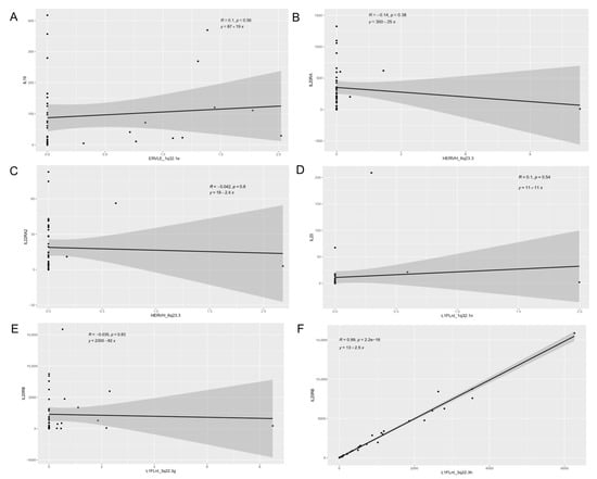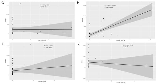 Three HERVs and seven L1 were localized close to the interleukin-20 family signaling genes (IL19, IL20, IL20RA, IL20RB, IL22RA2) (Table S3). We analyzed the association between retroelements expression and interleukin-20 gene family expression (Figure 4). Linear regression analysis showed a positive relation between L1FLnI_3q22.3h (R = 0.982, p < 0.001) and L1FLnI_3q22.3k (R = 0.5767, p < 0.001) with IL20RB expression (Figure 4F,H).