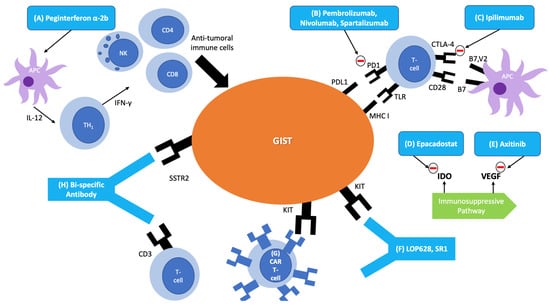 Immunotherapies in GIST. (A) Cytokine Therapy: Peginterferon alpha-2b is a cytokine-based therapy that is used in combination with imatinib to treat stage III/IV GIST. It functions by presenting an antigen cocktail to an antigen presenting cell (APC) to induce an IL-12 mediated TH1 immune response. The TH1 response secretes interferon-gamma and activates anti-tumoral immune cells. (B–E) Immune Checkpoint Inhibitors: (B) Pembrolizumab, Nivolumab, and Spartalizumab are programmed cell death protein-1 (PD1) inhibitors, preventing the PD1 and PDL1 interaction that leads to immune suppression and evasion of the immune system by cancer cells. (C) Ipilimumab is a CTLA-4 antibody, inhibiting the receptor’s function of sending inhibitory signals to T cells. (D) Epacodostat inhibits indoleamine-2,3-dioxygenase (IDO), an enzyme that decreases immune surveillance by downregulating NK and CD8 cells while upregulating T-regs. (E) Axitinib inhibits VEGF, thereby inhibiting the immunosuppressive function of VEGF. (F) Anti-KIT Antibodies: microtubule destabilizing maytansinoid (LOP628) and SR1 are monoclonal antibodies able to slow the growth of GIST via downregulation of KIT. (G) Cellular Therapy: Anti-KIT chimeric antigen receptor (CAR) T cells bind to GIST tumor cells leading to cell lysis. (H) Bi-specific monoclonal antibodies: binds to a somatostatin receptor (SSTR2) on tumor cells and CD3 to trigger a potent cytotoxic T cell response.