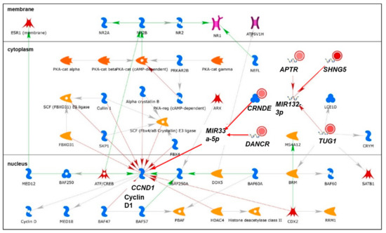 Network 2: TUG1, CRNDE, APTR, DANCR, and SNHG5, identified in lncRNAs downregulated by miR-29b-1-3p and miR-29a-3p in MCF-7 and/or LCC9 cells by MetaCore analysis. Green lines with arrows = stimulation; red lines with arrows = inhibition.