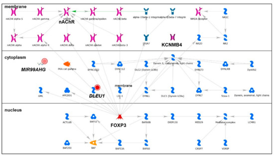 Network 4: DLEU1, MIR99AHG, FOXP3, KCNMB4, and nAChR delta, identified in lncRNAs downregulated by miR-29b-1-3p and miR-29a-3p in MCF-7 and/or LCC9 cells by MetaCore analysis. Green lines with arrows = stimulation; red lines with arrows = inhibition. nAChR = nicotinic acetylcholine receptor delta (CHRND). nAChRs are present in breast tumors (reviewed in [65]).