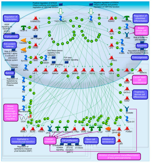 Pathway Map: development: YAP/TAZ-mediated co-regulation of transcription. The lncRNA UCA1 was upregulated by miR-29b-1/a in MCF-7 and LCC9 cells. Image is from MetaCore analysis.