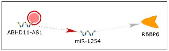 No information with respect to ABHD11-AS1 in BC was found in PubMed; however, ABHD11-AS1 is increased in colorectal carcinoma (CRC) [145], endometrial carcinoma [146], ovarian cancer [147], papillary thyroid cancer [148], and pancreatic cancer [149], implicating an oncogenic role for ABHD11-AS1 in these cancers. ABHD11-AS1 was identified in network 2 (Supplementary Table S4, Figure 7) and was depicted as negatively regulating miR-1254, which targets RBBP6 (RB binding protein 6, ubiquitin ligase). KM plotter [150] revealed no significant difference in OS in BC patients related to ABHD11-AS1 expression (data not shown).