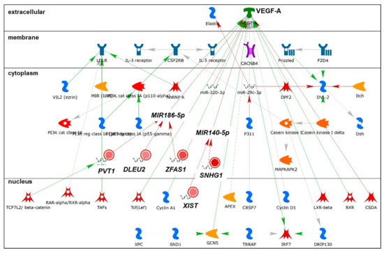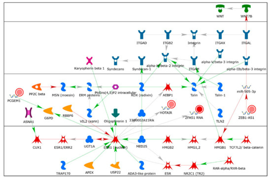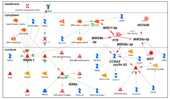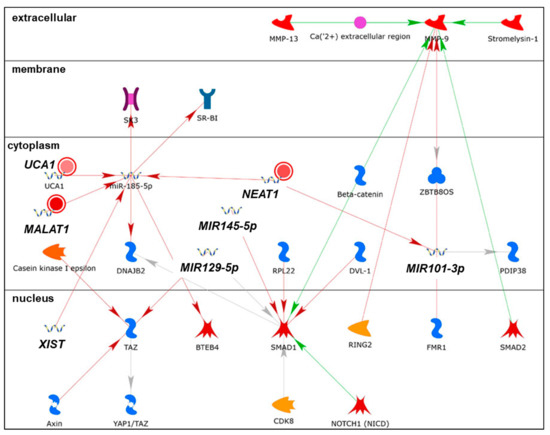 We identified 19 lncRNAs that were upregulated by anti-miR-29 in LCC9 cells and/or MCF-7 cells with pre-miR-29b-1/a + anti-miR-29 transfection (Table 1), suggesting miR-29 regulation. As described previously in our identification of differentially expressed genes (DEGs, i.e., mRNAs) regulated by miR-29b-1-3p and miR29a-3p (miR-29b-1/a) [35], we observed more lncRNAs downregulated by miR-29b-1/a in LCC9 than in MCF-7 cells (18 and two, respectively) with only TUG1 being downregulated by miR-29b-1/a in both cell lines. Fourteen miR-29b-1/a-downregulated lncRNAs were more highly expressed in MCF-7 cells than in LCC9 cells: SOX2-OT, LINC00473, MIR17HG, FIRRE, DLEU1, OIP5-AS1, JPX, DANCR, CYTOR, TUG1, SNHG8, SNHG5, DSCAM-AS1, and GAS5 (Table 1). Two miR-29b-1/a-downregulated lncRNAs were more highly expressed in LCC9 than in MCF-7 cells: LINC00221 and MIR99HG (Table 1). We used DIANA-LncBase v3.0 (Athens, Greece) [50] to examine lncRNA-miR-29b-1/a interaction and found that 10 of the 19 putative interactions identified in MCF-7 and/or LCC9 cells have been experimentally validated (Table 1). MetaCore enrichment analysis identified gene ontology (GO) processes, which are shown in Supplementary Table S1, but these only included the lncRNA TUG1. MetaCore network analysis is shown in Supplementary Table S2 and selected networks are shown in Figure 2, Figure 3 and Figure 4.