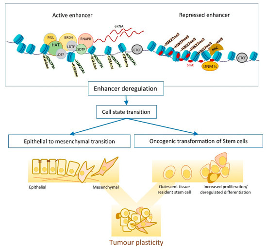 Schematic representation of the general features of active and inactive enhancers. The intra-tumour heterogeneity may arise from differentiation of cancer stem cells or EMT, two main processes that involve cell state transition and epigenetic reprogramming of transcriptional enhancers.