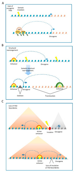 Contribution of mutations that affect enhancer sequence in cancer. (A) Somatic mutations can generate novel TF binding sites that recruit epi-modifiers that in turn can deposit epigenetic marks forming putative oncogenic enhancers. (B) Structural rearrangement of DNA can increase the expression of oncogenes by assigning ectopic enhancers to oncogenes via chromosomal translocation or by reducing the distance of enhancer to target promoter via deletions. (C) Mutations and structural rearrangement can influence the insulator regions and consequently can disturb TAD boundaries that shield oncogenes from nearby enhancers.