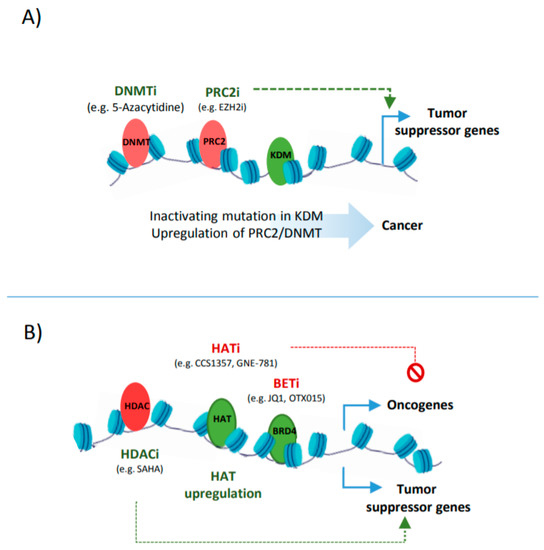 Targeting epigenetic modifiers in cancer by epi-drugs. (A) Excessive expression of transcription co-activators such as HATs and BRD4 in tumours leads to upregulation of oncogenes. Inhibition of HATs by CCS1357, GNE-781, JQ1 and OTX015 can abolish their enhancing effect on oncogenes. Hyper activation of HDACs can lead to repression of tumour suppressor genes by removing activating acetyl marks at corresponding regulatory elements. HDAC inhibitors such as SAHA can restore the reduced expression of tumour suppressor genes in cancer. (B) Elevated levels of DNMTs and PRC2 can lead to expansion of suppressive methylation marks at regulatory elements that control tumour suppressor genes. Targeting DNMT and PRC activity by chemicals such as 5-Azacytidine and EZH2i, EPZ-6438, can resolve the repressed chromatin and restore the expression of tumour suppressor genes.