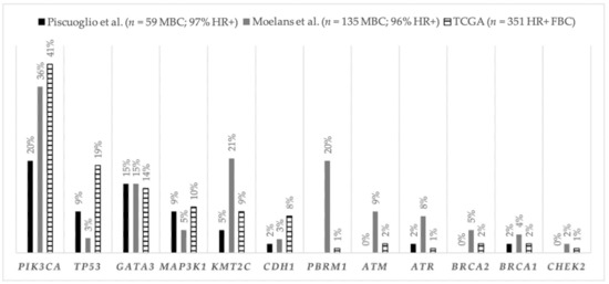 The study by Piscuoglio et al. [59], encompassing 59 MBC cases, of which 97% were ER-positive/HER2-negative tumors (71% luminal B-like), sequenced 241 genes most prevalent in FBC, demonstrating that PIK3CA, GATA3, TP53, and MAP3K1 were significantly mutated. In the same fashion as for FBC, differences in the frequencies of mutated genes within each luminal subgroup were found, with PIK3CA, HER2C2, and MAP3K1 being the most frequently mutated genes in luminal A-like MBC (all at 12%), whereas PIK3CA (24%) and GATA3 (21%) were the most frequently mutated in luminal B-like MBC. Of note, mutations in DNA repair genes were more frequent within luminal B-like MBC than luminal A-like MBC (33% and 6%, respectively; p = 0.04). Another study by Moelans et al. [60], including 135 MBC cases (96% luminal subtype), confirmed the high prevalence of PIK3CA and GATA3 mutations and, also, demonstrated the high frequency of PBRM1 and KMT2C PVs in this population. In the TCGA BC program, two MBC harbored PIK3CA PVs, and no TP53 PVs were identified [58].