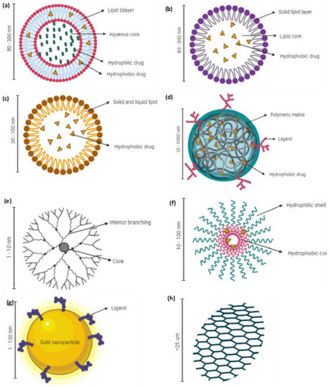 Schematic representation of various nanocarriers experimented for the treatment of non-small cell lung cancer with their respective particle sizes. (a) Nanoliposomes, (b) solid lipid nanoparticles, (c) nanostructured lipid carriers, (d) polymeric nanoparticles, (e) dendrimers, (f) polymeric micelles, (g) gold nanoparticles, and (h) graphene (created using BioRender.com, accessed on 2 April 2021).