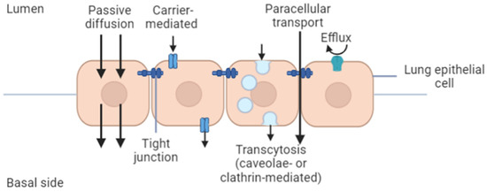 Schematic diagram of different absorption mechanisms in lung epithelium (created using BioRender.com, accessed on 2 April 2021).