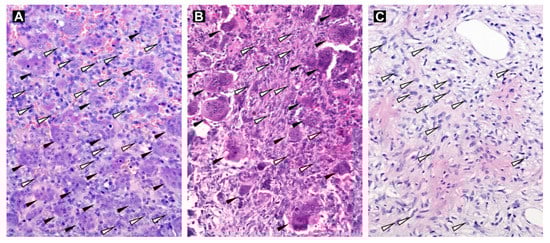 Hematoxylin-eosin-stained tissue sections of GCTB samples. Tumor tissue without denosumab treatment (Sample No. 4; A) and tissue of a relapsed sample (Sample No. 1; B) with osteoclast-like multinucleated giant cells (black arrowheads) and mononuclear stromal cells (white arrowheads; examples only). GCTB sample after denosumab treatment without the presence of osteoclast-like giant cells (Sample No. 3; C). Original magnification, 200×.