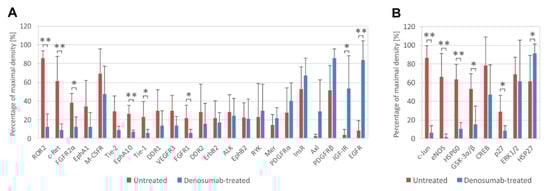 Phosphorylation analysis of RTKs and downstream signaling proteins in ten fresh-frozen GCTB samples (untreated, n = 5; denosumab-treated, n = 5). Highly phosphorylated RTKs (A) and downstream signaling proteins (B) are displayed. The cutoff level was set as 20% of maximal density. Phosphoproteins are arranged in order of differences between denosumab-treated and untreated samples. The data represent the mean ± SD. * p < 0.05, ** p < 0.01, indicating a significant difference between experimental groups.