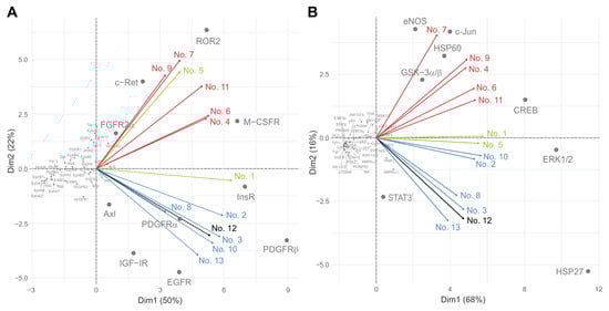 PCA of data determined for RTKs (A) and downstream kinases (B). Red vectors: samples from patients not treated with denosumab (Nos. 4, 6, 7, 9 and 11); blue vectors: samples from patients obtained immediately after denosumab treatment (Nos. 2, 3, 8, 10 and 13); green vectors: samples from relapsed denosumab-treated patients (Nos. 1 and 5); black vector: sample from patient treated with denosumab and sunitinib simultaneously (No. 12).