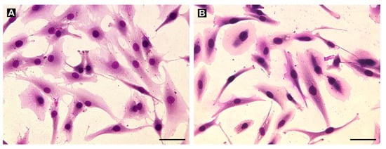 To establish an in vitro model of GCTB, we derived nine cell lines from the patient tumor tissues and subsequently characterized the cultured cells. Giemsa staining of all patient-derived cell lines showed the presence of mostly mononuclear (stromal) cells with a fibroblast-like morphology over a few passages (Figure 4). Moreover, regarding cell morphology, no differences between cell lines derived from samples obtained from patients with (Figure 4A) or without denosumab treatment (Figure 4B) were found.