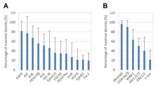 Phosphorylation analysis of RTKs and downstream signaling proteins in GCTB-derived cell lines. Highly phosphorylated RTKs (A) and downstream signaling proteins (B) are displayed. The cutoff level was set as 20% of maximal density. Phosphorylated proteins are arranged in order of percentage of maximal density. The data represent the mean of values of five (A) or six (B) analyzed cell lines ± SD.