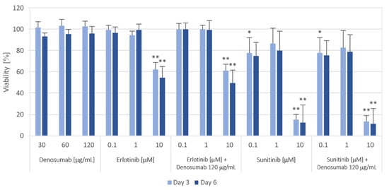 Proliferation of GCTB cell lines after 3 and 6 days of the selected treatment. Cell viability was measured using the MTT assay on Days 3 and 6 of cultivation with different concentrations of the RANKL inhibitor denosumab, EGFR inhibitor erlotinib and PDGFR inhibitor sunitinib or their combinations. The values were compared with those of untreated control cells (untreated controls were set as 100%). The data represent the mean of values of nine analyzed cell lines ± SD. Experiments with each individual cell line were performed in triplicate. * p < 0.05, ** p < 0.01, indicating a significant difference from the control.