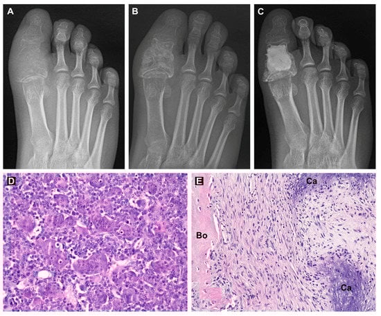 X-ray images of the patient’s right big toe during the treatment: before treatment (A), one month after combination treatment with denosumab and sunitinib (B) and after curettage and bone cavity filling with bone cement (C). Hematoxylin-eosin-stained sections of GCTB tissue before treatment (D) and after combination treatment with denosumab and sunitinib (E). Regions of bone tissue (Bo) and calcifications (Ca) are labeled. Original magnification, 200× (D,E).