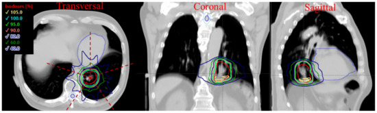 A cohort of 9 consecutive lung cancer patients previously treated by proton SBRT was replanned using transmission FLASH beams for the study. The transmission plans were developed with two different standard-of-care prescriptions: 45 Gy in 3 fraction and 34 Gy in 1 fraction for all patients [32,33]. Since the short beam-on time of each treatment field (<1 s), the dose interplay effect [34] may not be a concern for each treatment field, while in between fields and fractions, the target motion still needs to be considered. Thus, 4 DCT and the internal target method were used to compensate for the inter-fractional and intra-fractional tumor motion. The internal clinical target volume (iCTV) was generated on an averaged-CT by the union of CTVs on the corresponding 10-phase images of a 4 DCT. The iCTV volume varied from 24 to 226 cm3 with a median value of 61 cm3. All plans were generated using a 5-beam arrangement with 72 degrees equal angle intervals to give uniform dose distributions to the target. Figure 1 shows the dose distribution and beam arrangement for a typical case, with target coverage for all cases normalized to 100% iCTV receiving 95% of the prescription dose for comparison purposes. The higher the minimum MU/spot in an energy layer, the higher the SPDR can be achieved. The minimum 100 and 400 MU/spot, representing medium and high dose rates, were chosen as the threshold for treatment planning. In total, 36 transmission FLASH-RT plans were optimized for this study.