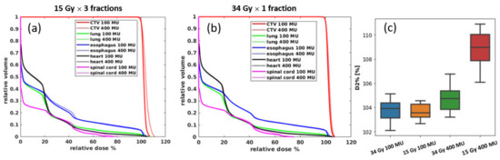 All transmission plans could achieve a reasonably good uniformity (hotspot < 110% of prescription dose). Figure 5a,b shows the averaged DVHs of the target volumes and OARs for all nine patients. The 100 MU plan had a better uniformity and lower OAR doses for both of the different prescriptions. As shown in Figure 5c, the D2%, representing the hot spots dose volume, can be reduced by ~5% in the 15 Gy plans using 100 MU/spot instead of 400 MU/spot, whereas, for the 34 Gy plan, the hot dose difference is minimal between two different MU/spot settings. This indicates that the plan with a higher fraction dose (34 Gy/fraction) could have better uniformity by using both low and high (100 and 400) MU/spot, whereas the lower fraction dose (15 Gy/fraction) plan needs a smaller minimum MU/spot to achieve a more uniform dose distribution.
