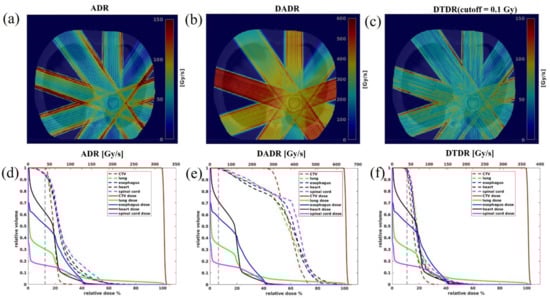 The dose rate distribution was calculated for each field then overlaid on the CT images. Therefore, the voxels having non-zero doses for each field were included for DRVH calculation, and the DRVH of a plan was sampled from all five fields. Figure 6a–c shows the 3D dose rate distributions over the patient anatomy for each beam angle, calculated using ADR, DADR, and DTDR methods. As seen in Figure 6a–c, the high dose rate regions often occurred at the field edge for ADR and DTDR, while DADR resulted in a better dose rate uniformity over the whole field. All three dose rates attenuated along the beam direction due to the protons being scattered gradually when passing through tissue. Figure 6d–f shows the DVHs and DRVHs for the target and OARs; as shown in Figure 6d, a notable portion of OARs received irradiation at dose rates below 40 Gy/s dose rate threshold when using the ADR method, whereas the majority of the volume of each OAR received irradiation with a dose rate > 40 Gy/s when using the DADR and DTDR methods.