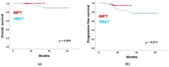 (a) Overall survival; (b) progression-free survival. Kaplan–Meier analysis of the IMPT and VMAT patients. Abbreviations: IMPT: Intensity-modulated proton therapy, VMAT: Volumetric modulated arc therapy.