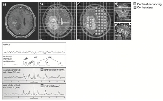 - Walchhofer, L.M.; Steiger, R.; Rietzler, A.; Kerschbaumer, J.; Freyschlag, C.F.; Stockhammer, G.; Gizewski, E.R.; Grams, A.E. Phosphorous Magnetic Resonance Spectroscopy to Detect Regional Differences of Energy and Membrane Metabolism in Naïve Glioblastoma Multiforme. Cancers 2021, 13, 2598. [Google Scholar] [CrossRef]