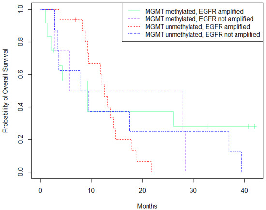 The largest group were patients with MGMT-unmethylated, EGFR amplified tumors and MGMT-methylated, EGFR amplified tumors. They were followed by patients with MGMT-unmethylated, EGFR not amplified tumors. The smallest sample of patients were those with MGMT-methylated, EGFR not amplified tumors (Table 2).